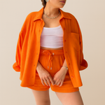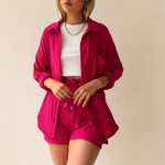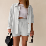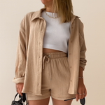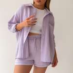 Ultra-doux, respirant et naturellement élégant, l’Ensemble 2 Pièces en Gaze de Coton Ultra-Léger vous accompagne du brunch à la plage. La chemise oversize boutonnée peut se porter ouverte ou nouée pour varier les styles, tandis que le short à taille élastiquée avec cordon assure un confort absolu. Sa texture gaufrée aérienne et son tombé fluide signent une allure minimaliste et chic, facile à accessoiriser avec des sandales ou des baskets.