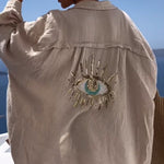 Découvrez cette chemise en coton oversize avec un motif d'œil en sequins au dos. Confectionnée en Italie, elle combine élégance et confort pour toutes vos occasions estivales.